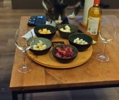 Altijd goed. Houd je ook van een beetje pittige kazen? Wij vinden het lekkerste om 1 brie, 1 Iberico en 1 blauwe kaas te nemen met een fuet of andere gedroogde worst.