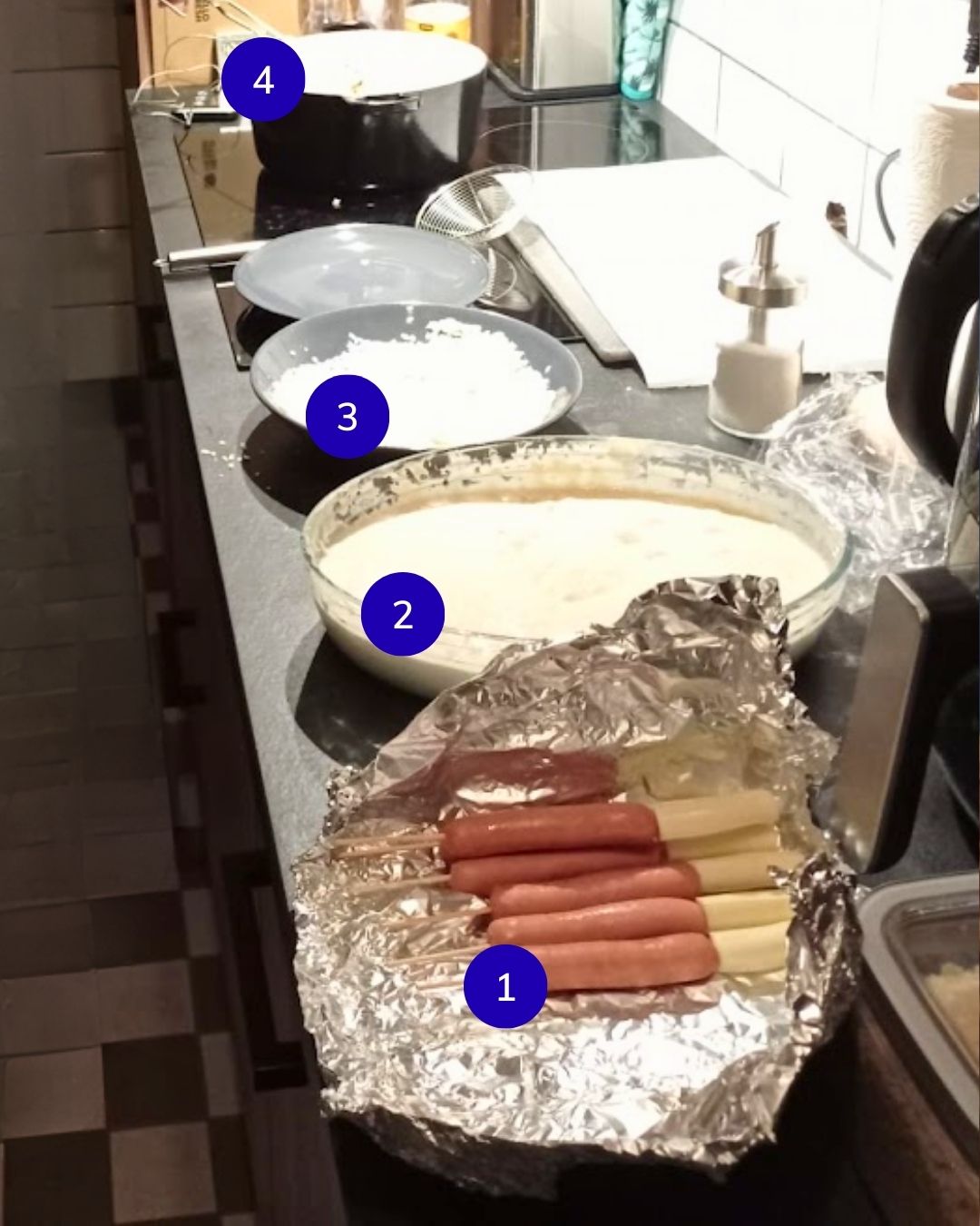 Maak een productie lijn zodat je zo per stap kan door schuiven en aan het einde de hotdogs gelijk in de frituur kan doen.